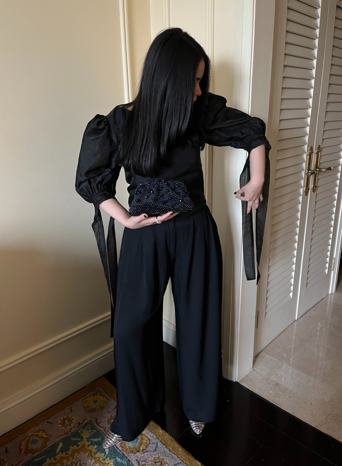 Inherent with green silk velvet and encrusted tonal crystal beads all around - she’s a mesmeric outfit companion to any look. The undulating texture from the beads and pleating of the fabric add character and the signature Aomidori Shimai glimmer.