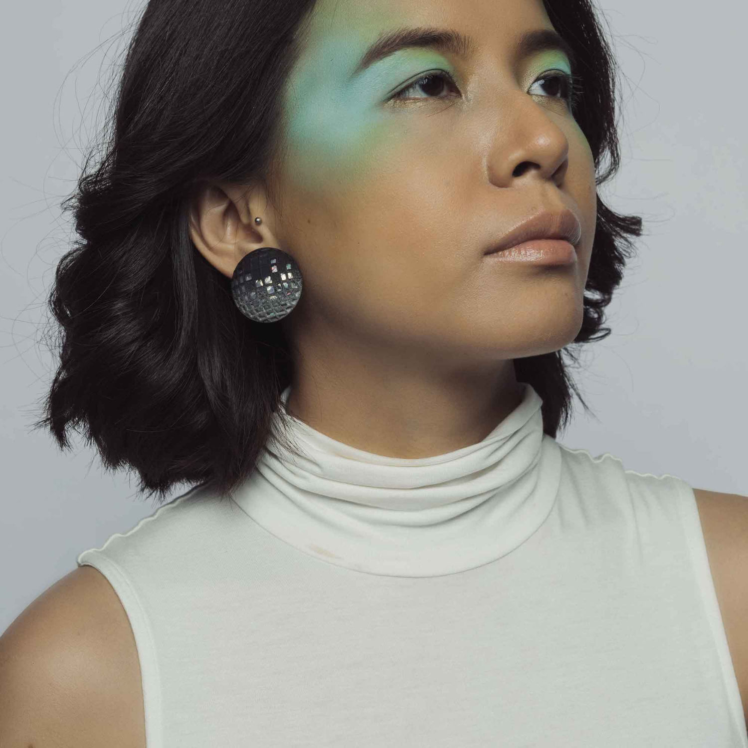 Sparkle and shine responsibly. Handmade using sustainable 3D printing processes we bring to you Glint. Made up of lightweight geometric parts, the iridescent film provides the sparkle that completes each piece.
